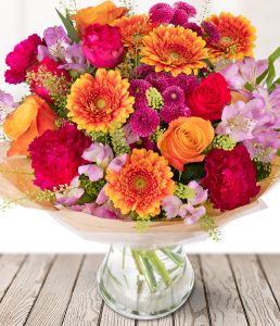 Spring Daze is a fun and colourful bouquet with purple alstroemeria and carnations, warming orange germini, and gorgeous cerise and orange roses. Sent in our signature Eflorist box for safe transit, this bouquet is sure to enchant the recipient from the moment they open it. Enjoy our nationwide delivery and know exactly when the flowers are delivered with tracking. An instant mood booster with a surprisingly small price tag!