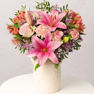 An enchanting assortment of pink Roses, blush Carnations with a show-stopping strawberry pink Lily. The Pistache foliage and whimsy pink Limonium add depth and lushness to the bouquet.